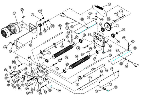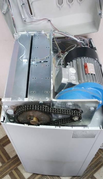 Шредер, оснащен одним двигателем высокой мощности (2.1 кВт) скомплектованный с понижающим редуктором и двухрядной цепной передачей на режущие валы.